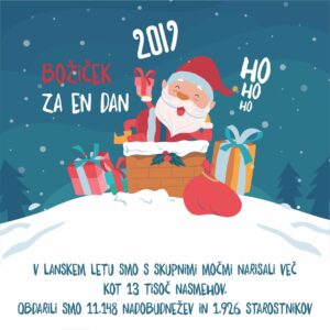 Majhna škatla za VELIK nasmeh! Akcija Božiček za en dan je popolnoma neprofiten projekt, izpeljan v celoti s strani prostovoljcev. Je gibanje, ki s pravo mešanico ustvarjalnosti in humanosti ljudem nudi priložnost razdajanja. S kreativnostjo zapakirana škatla polna ljubezni in dobrote malim nadobudnežem pričara nasmeh na obraz. Darila lahko podarite tudi starostnikom, in jim polepšate dan.