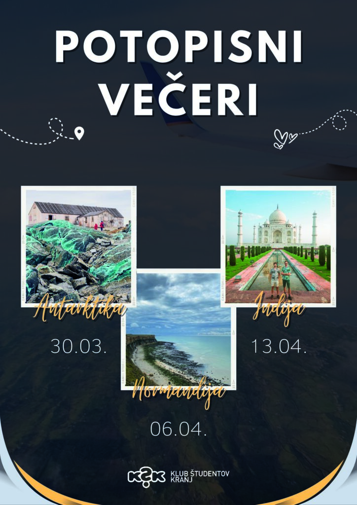 Klubski potopisni večeri se vračajo! Kot vsako leto nas bodo tudi tokrat mladi raziskovalci navdušili s svojimi avanturami in prigodami. Vabljeni vsi, ki si želite potovati po svetu ali pa vas o teh deželah zanima še kaj več! Potopisni večeri so seveda BREZPLAČNI, odvijali pa se bodo v baru Mitnica v Kranju.